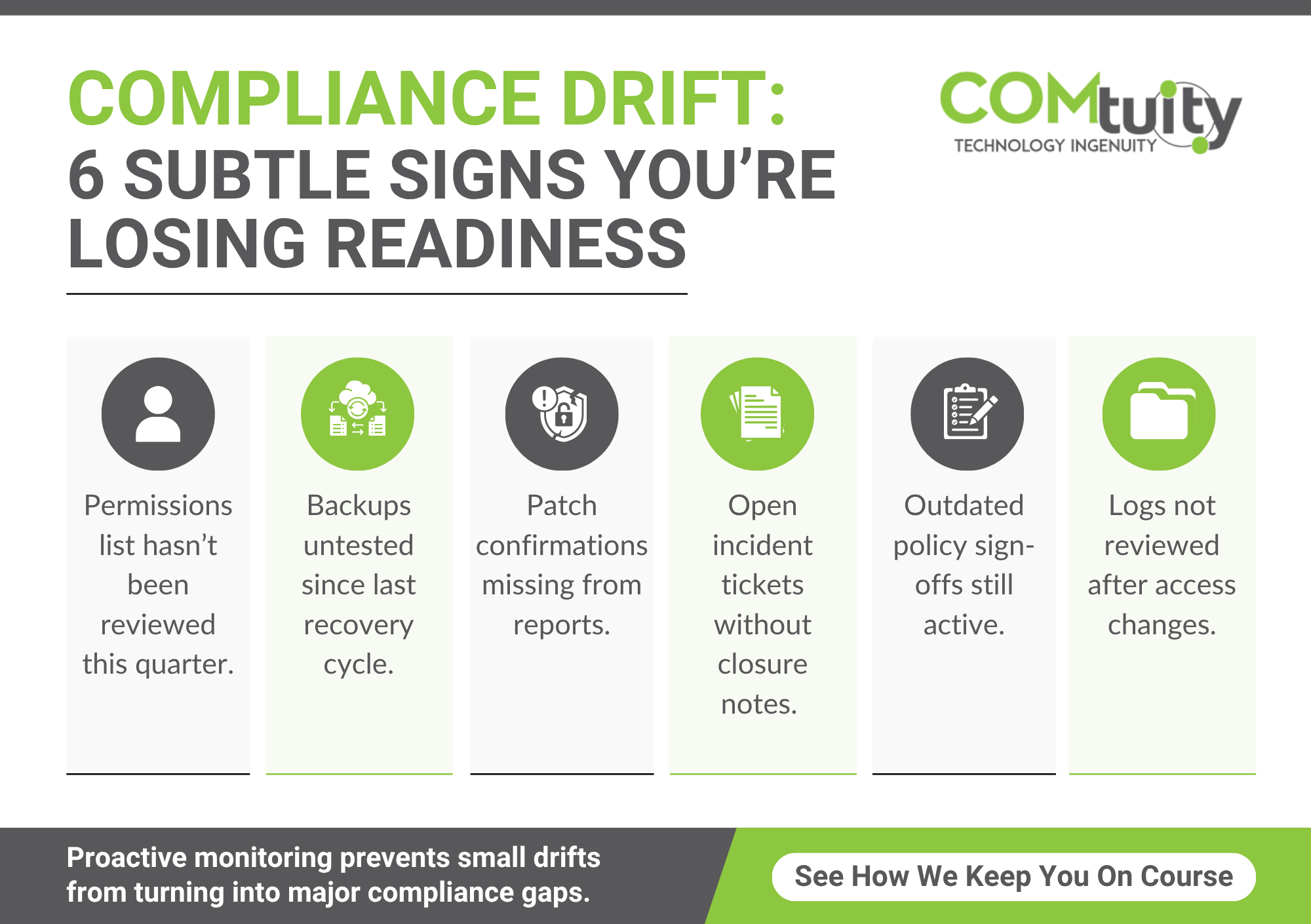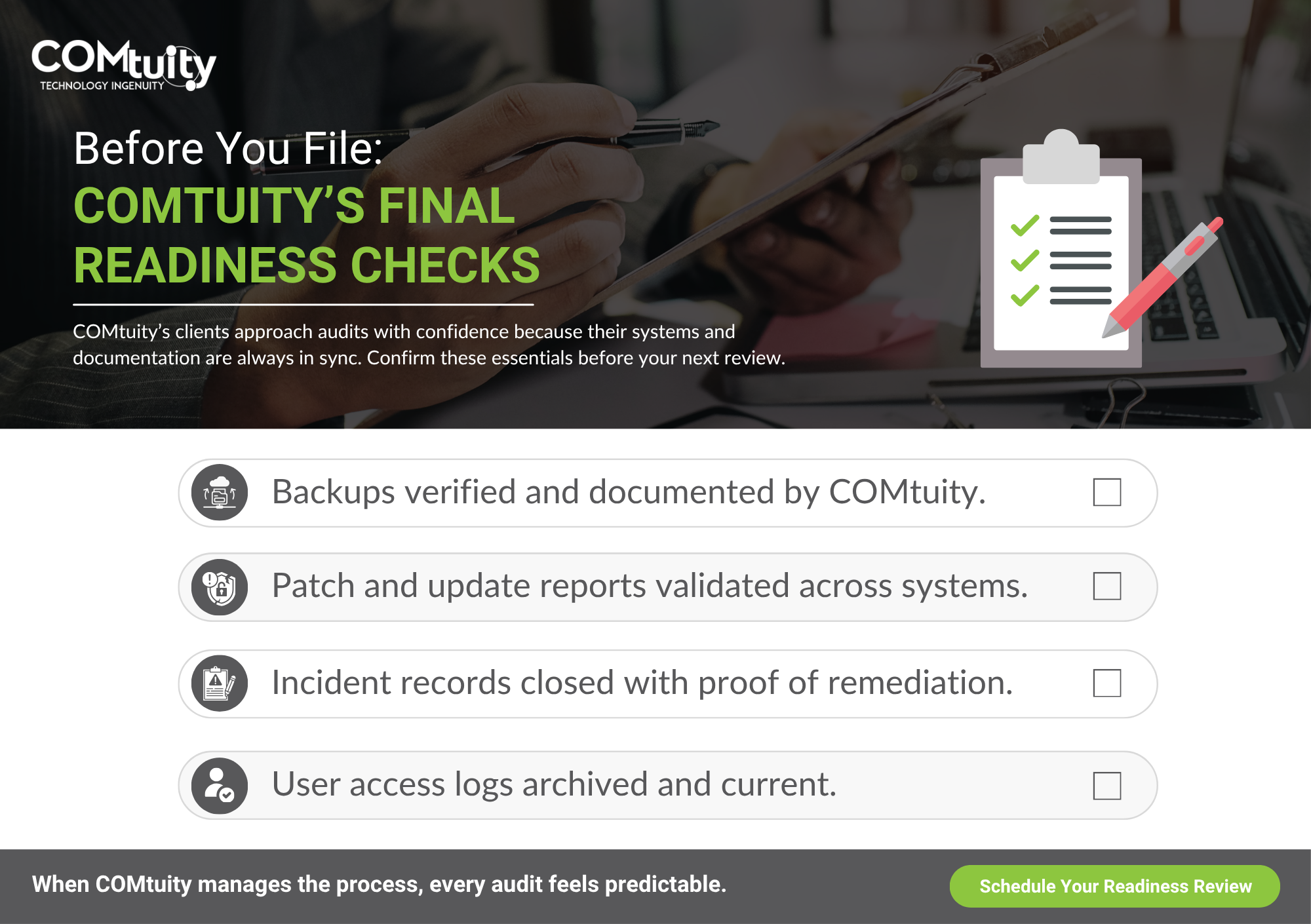 At COMtuity, we can help. We guide the shift from reactive preparation to steady readiness. Through ongoing advisory of cybersecurity, vendor management, and more, your team stays organized and audit-ready all year long.